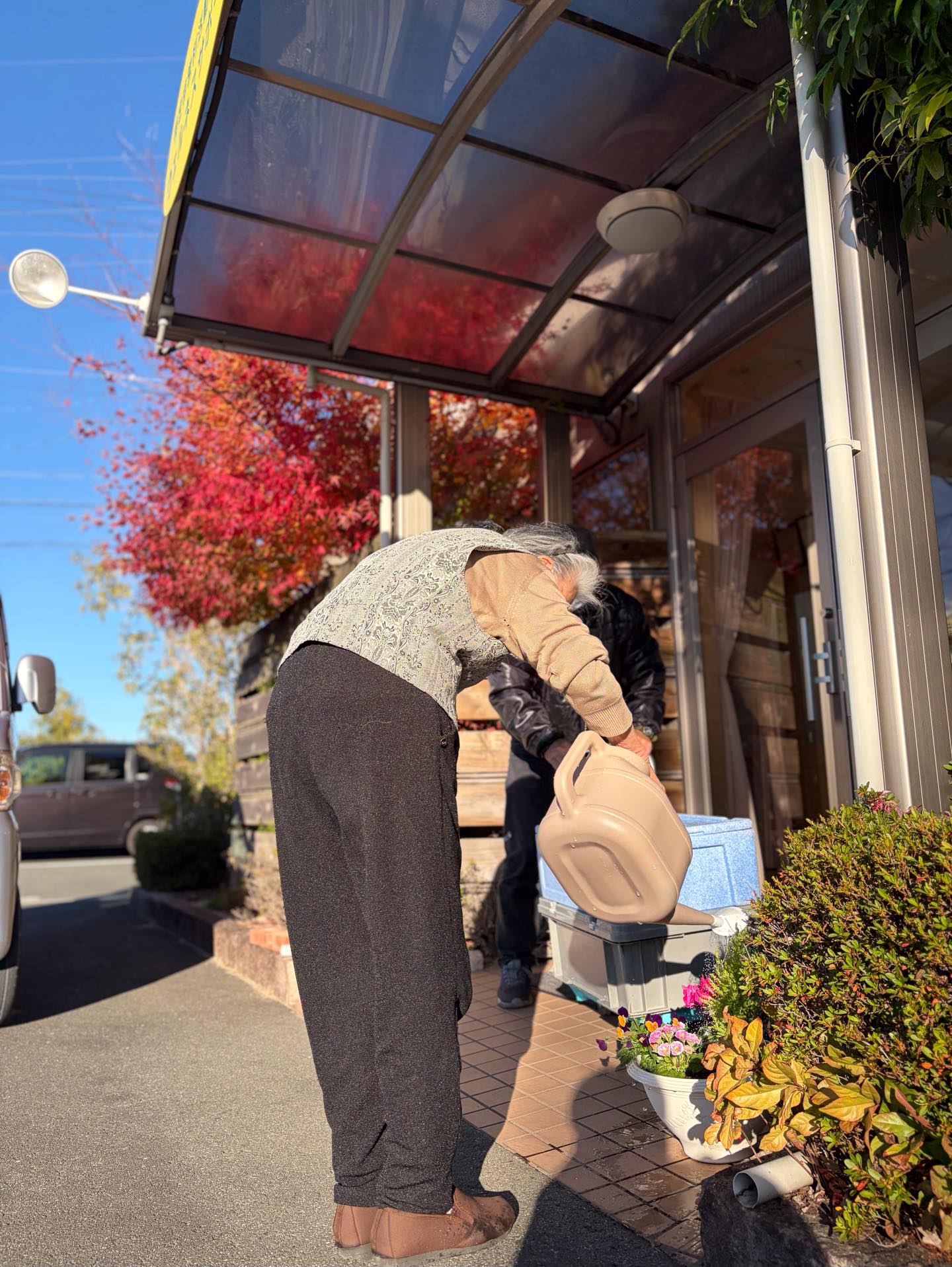 デイサービスの中庭にあるもみじが綺麗な色になってきました。